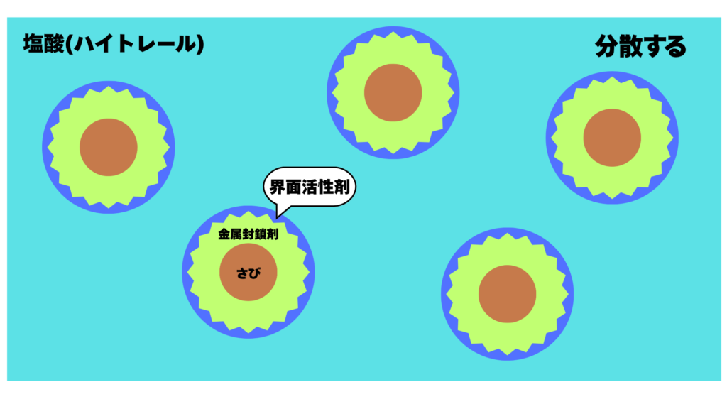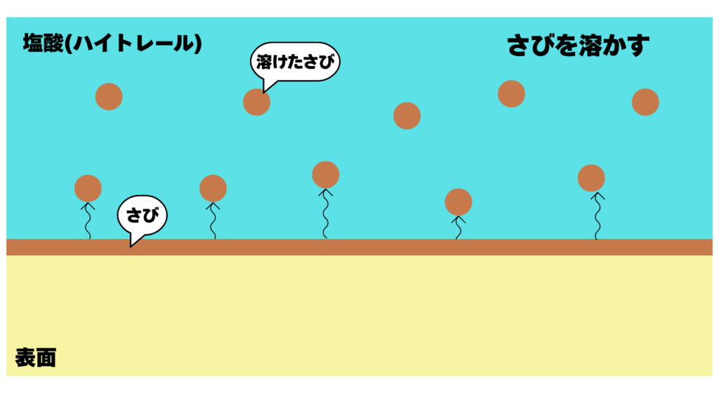 成分1:塩化水素──要するに塩酸です。酸の力で金属酸化物を溶かします。