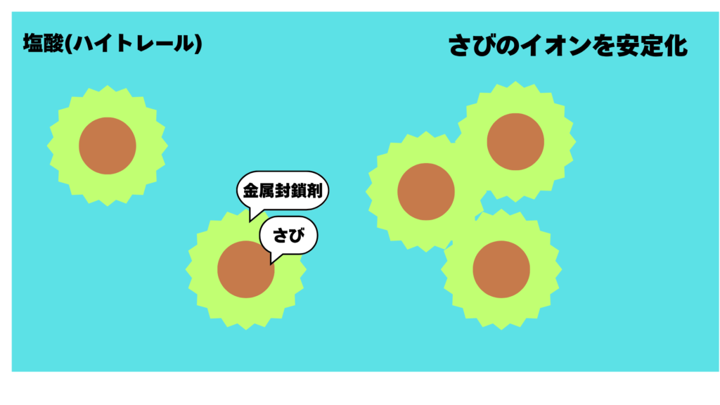 成分3:キレート剤──溶けた金属イオンを捕まえ、製品を安定化させます。キレートはカニのハサミが金属イオンを挟んで捕まえている様子をイメージして作られた言葉です。これが酒石酸にあたるでしょうか。