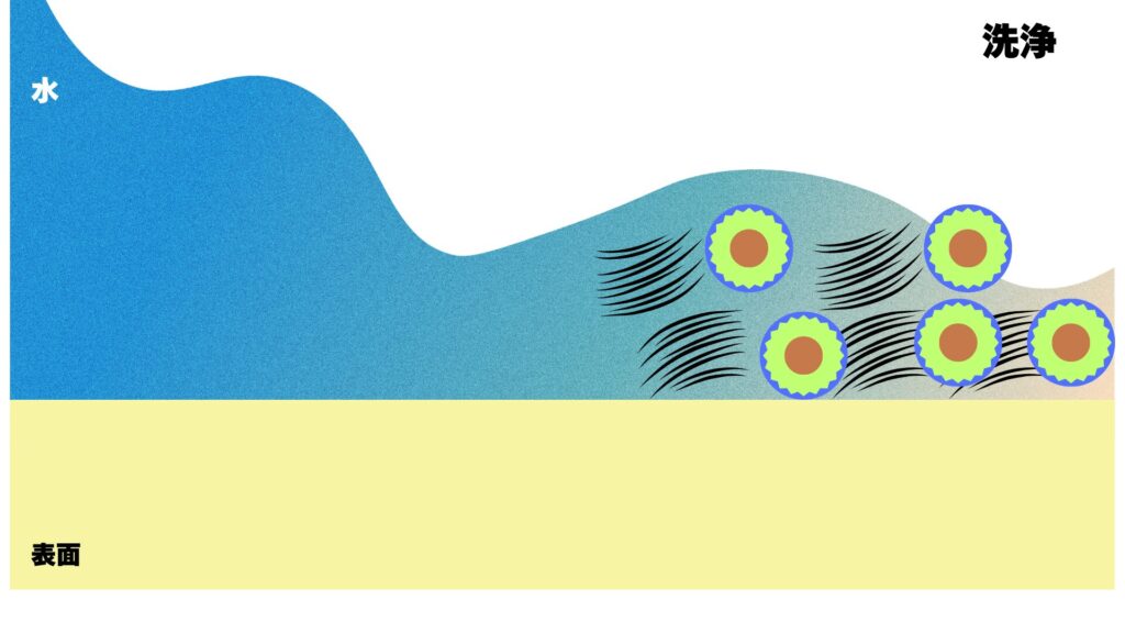 成分2:非イオン界面活性剤──汚れ粒子を微細化し、水中に分散させます。非イオン系は酸の影響を受けにくくするためです。