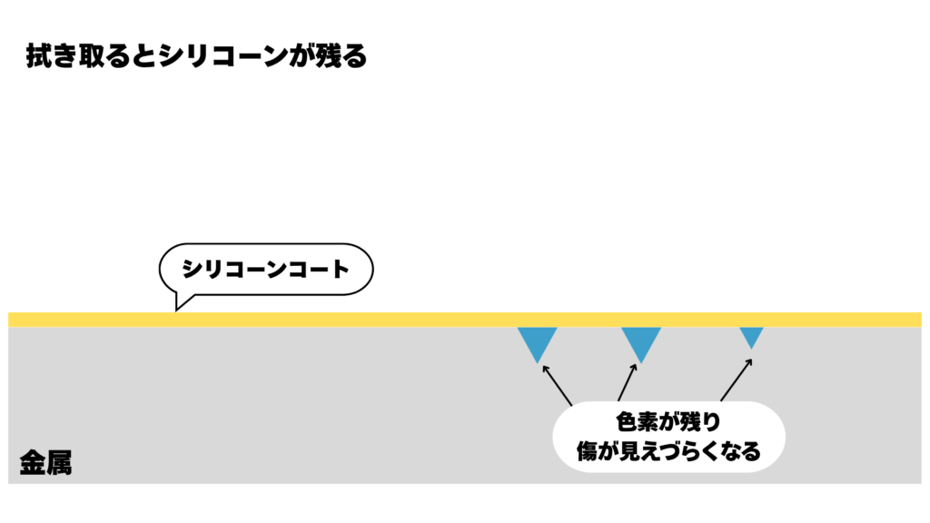 4. 青い顔料が細かい傷に入り込み乱反射を抑え、くすみを消し、光沢を付与します。