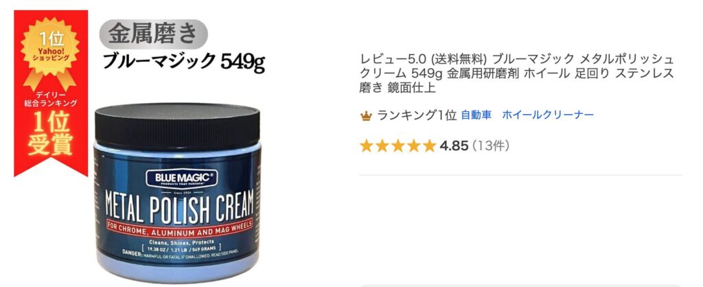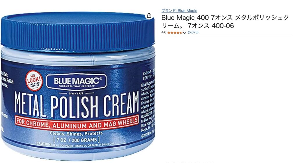 ブルーマジック メタルポリッシュクリームは車やバイクの金属パーツ部分の研磨にとても評判が高い研磨剤です。別記事で紹介した「ハイトレール」では推奨されないアルミパーツなどへも使えます。
