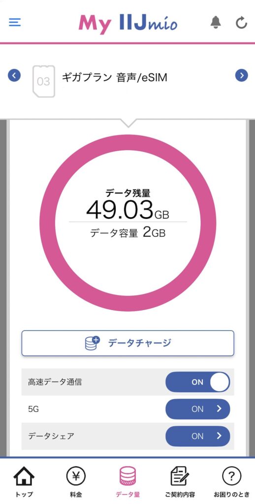 また、専用アプリで残量をリアルタイムで確認できるので、「使いすぎたかも?」と不安になることもありません。こちらがアプリのスクリーンショットです。我が家では全員で約40GBという契約にしていますが、キャンペーン期間中は、使えるデータ量としては49GBまである状態です。